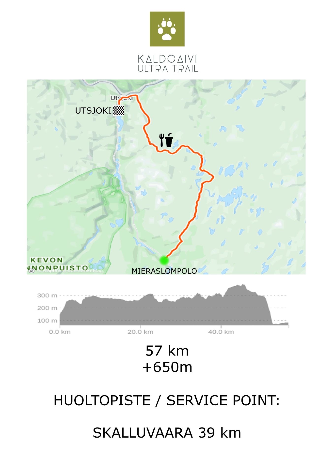 Matka 57 km, josta yli 50 kilometriä Kaldoaivin erämaassa. Nousumetrejä reitillä on noin +650 m. Suoritusaika reitille enintään 14 tuntia.